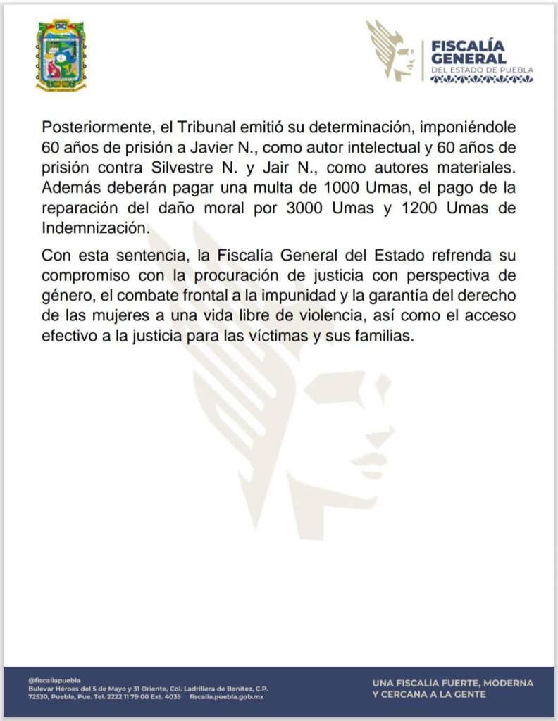 Con esta sentencia, la Fiscalía General del Estado refrenda su compromiso con la procuración de justicia con perspectiva de género, el combate frontal a la impunidad y la garantía del derecho de las mujeres a una vida libre de violencia, así como el acceso efectivo a la justicia para las víctimas y sus familias.