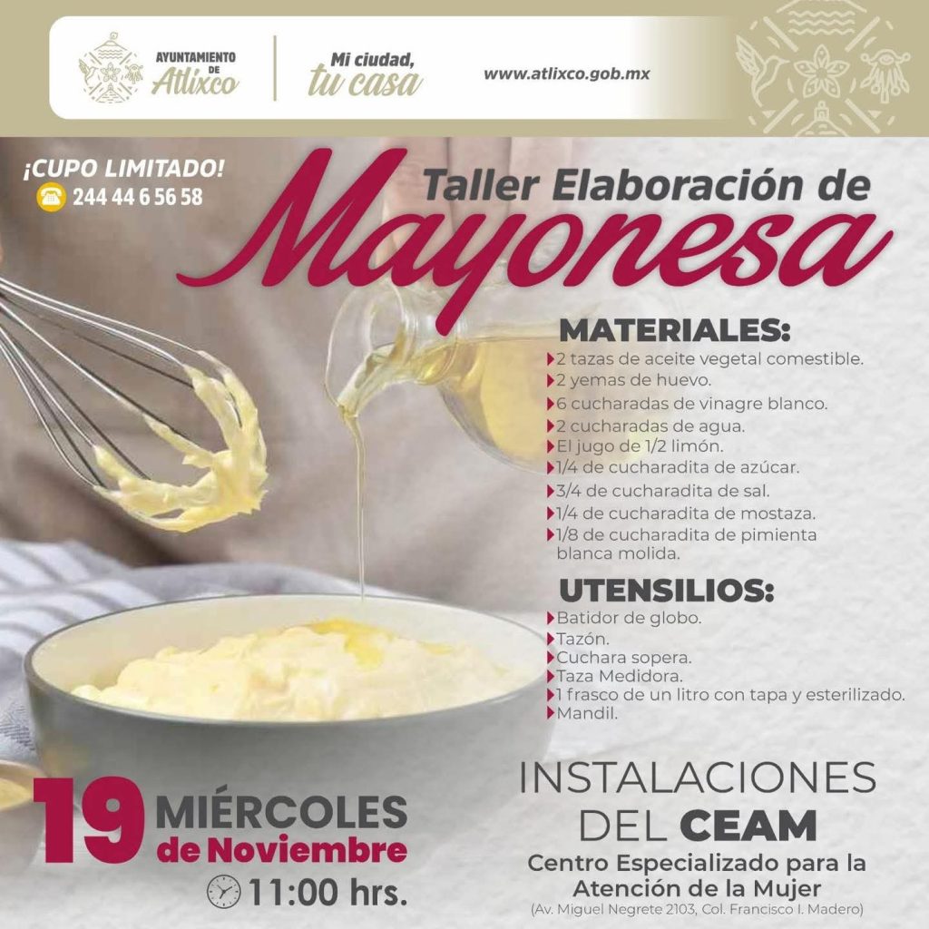 El gobierno de Atlixco continúa impulsando acciones en beneficio de la mujer, a través del Centro Especializado para la Atención de la Mujer (CEAM), invita al taller de elaboración de mayonesa casera el día de mañana miércoles 19 de noviembre a las 11 de la mañana en las instalaciones del CEAM, ubicadas en Av. Miguel Negrete 2103, Col. Francisco I. Madero.