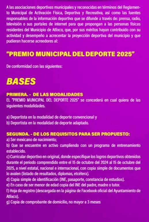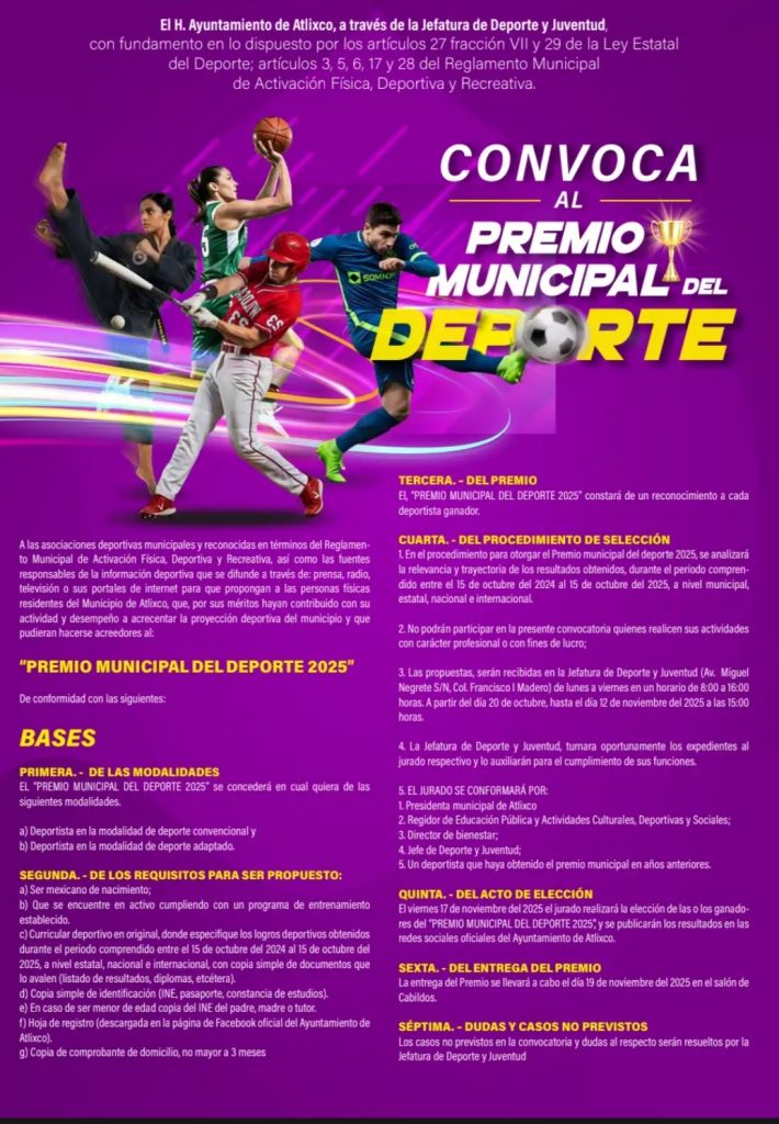 El gobierno de Atlixco a través de la Jefatura de Deporte y Juventud, invita a deportistas a mostrar su trabajo deportivo para contender al Premio Municipal del Deporte, el cual busca reconocer el esfuerzo, trabajo y disciplina de los atlixquenses deportistas.