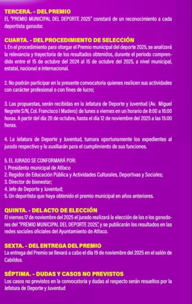 De acuerdo a la convocatoria, los participantes deberán reunir todos sus logros obtenidos del 15 de octubre del 2024 al 15 de octubre del presente año, un jurado evaluará los resultados de dichos logros para así dar a conocer al ganador del Premio Municipal del Deporte.