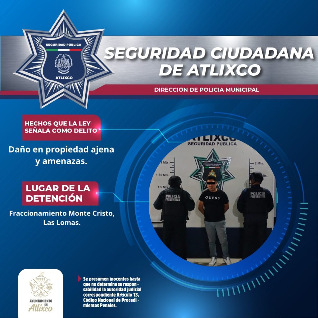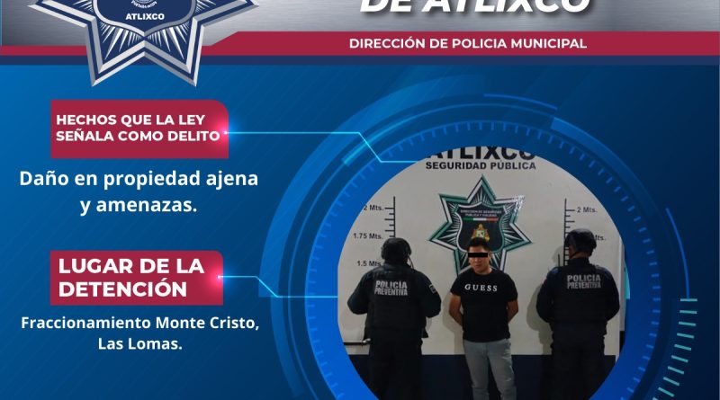 Elementos de la Policía de Atlixco aseguraron a un hombre en el fraccionamiento Monte Cristo, luego de que vecinos lo señalaron por causar daños a un domicilio, amenazas y agredir físicamente a una mujer.
