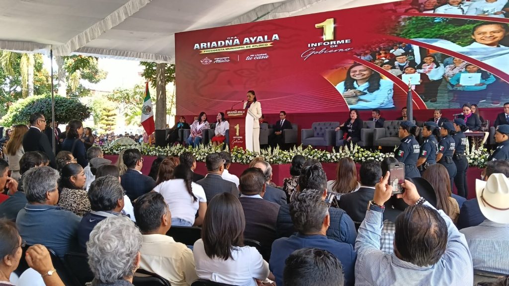 En Plaza de Armas, el corazón del municipio, la alcaldesa Ariadna Ayala rindió su primer Informe de Gobierno de su segundo periodo a cargo de la administración municipal (2024–2027), destacando acciones en beneficio del desarrollo social, económico y cultural del municipio.